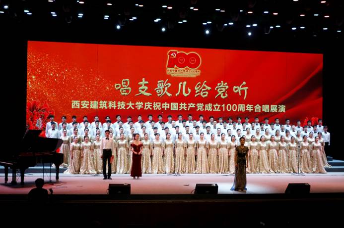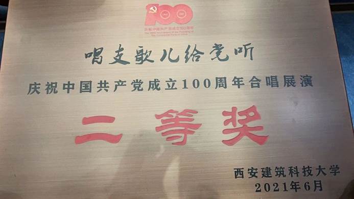 百人师生合唱团在“唱支歌儿给党听——西安建筑科技大学庆祝中国共产党成立100周年合唱展演”中合唱《在灿烂阳光下》,荣获二等奖。