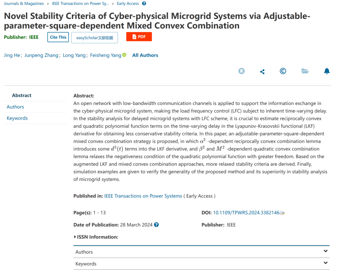近日,我校捷报比分app 青年教师贺静副教授在国际顶级期刊TPS(中科院一区TOP,影响因子6.6)上发表题为“Novel stability criteria of cyber-physical microgrid systems via adjustable-parameter-square-dependent mixed convex combination”(基于可调参数平方依赖混和凸组合的信息物理融合微电网新颖的稳定性判据)的学术研究论文,贺静副教授为该论文的第一作者,西安建筑科技大学为第一完成单位。