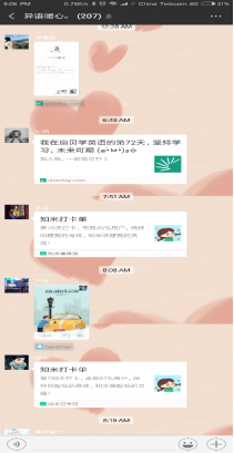 2018年1月19日建立单词打卡群,培养英语学习习惯。“异语暖心”微信群自建立,目前群中成员共210人,截至目前,群内同学累计记忆单词563760余个,9396人次,每人每天平均记60个单词。据部分同学的反应——“每天不记单词就感觉缺少些什么”——这给了我们坚持下去的勇气。