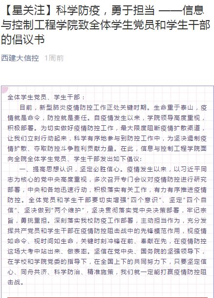 疫情期间,学生党员带头通过线上“学习强国”平台了解掌握国家对疫情防控工作的最新动态,掌握习近平总书记调研指明的战“疫”方向,了解全国同胞为打赢疫情防控攻坚战所做出的贡献。科学防疫是关键,捷报比分app 的学生党员通过线上自媒体平台向广大师生和家长分享防控手册、防疫攻略及辟谣信息,呼吁大家不信谣、不传谣,科学合理地做好防疫工作。学生本职是学习,学生党员带头做好了学习规划,带领同学们充分利用免费学习资源,主动进行自学,提前做好新学期学业准备和职业展望,积极准备各类创新创业竞赛,不断加强思想学习。特别针对大四及研三学生,积极组织和鼓励毕业班学生参加网络招聘,搭建就业服务平台。
