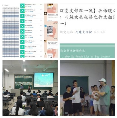 学生的理工科专业特点,大部分学生,尤其是男生外语水平、语言组织能力较弱的情况,为了提升口语交际能力,提高四六级考试及英语期末考试成绩通过率,并能在对外交流中熟练掌握一门外语。2017-2018学年第四党支部“异语暖心”小组开展以下特色活动: