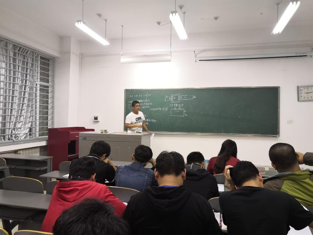 在将考试的重要知识点进行归类划分后,四位同学分章节分模块对重难点知识进行讲解。首先付蓉同学就"电磁绕组方式","励磁方式","电动机和发电机的区别及其电压平衡关系"四个方面对"功率平衡关系对直流电动机和发电机的工作原理及机械特性"知识点进行分析。同时她又针对章节内容复杂抽象、难以理解的现状与同学们分享了自身的学习方法,又结合相应图形来进行例题讲解,帮助同学们对解题方法有更深入的理解记忆。随后孙松婷同学将书本第二章与第七章内容进行讲解,着重分析了书中"如何判断电力拖动系统是否稳定工作"、"转矩以及飞轮矩的折算"以及"异步电动机的工作原理"三块内容,并点出了章节中的几个重要公式。紧接着石功林与陈帅超同学分别对"他励直流电动机的启动"、"调速和制动"与第五章的变压器内容进行讲说。石功林同学重点讲解了电动机的三种制动方法,将能耗、反接以及回馈制动的特性曲线与相应的电路图相结合,为同学们梳理了相关的知识点,并结合例题帮助同学们理清做题思路。陈帅超同学借助一字形和T形等效电路讲说了第五章的"变压器参数求解"与"变压器联结组标号"两个主要考试题型。在结合例题讲解的同时,他又给出相应的解题技巧,鼓励同学们做题要更加细致认真。