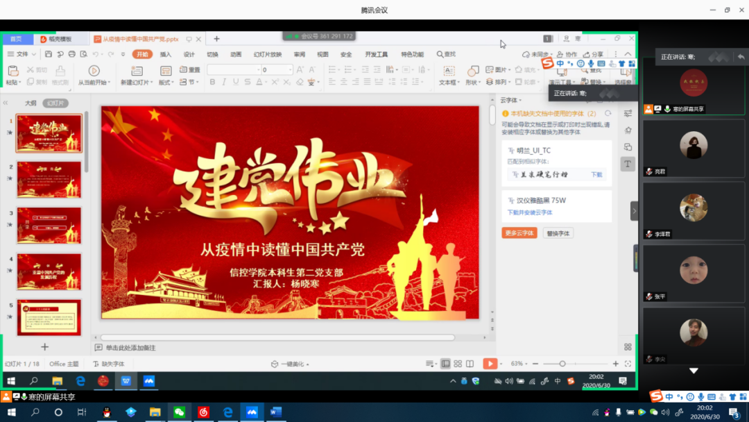 在中国共产党成立99周年之际,为回顾党的光辉历程,讴歌党的丰功伟绩,同时学习贯彻习近平总书记来陕考察重要讲话重要指示精神,以及党中央关于常态化疫情防控的决策部署,充分发挥基层党组织战斗堡垒作用和党员先锋模范作用,6月30日晚,捷报比分app 本科生第二党支部于线上开展了战“疫”专题微党课,本次党课由党支部书记杨晓寒同志进行题为“从疫情中读懂中国共产党”的党课报告。