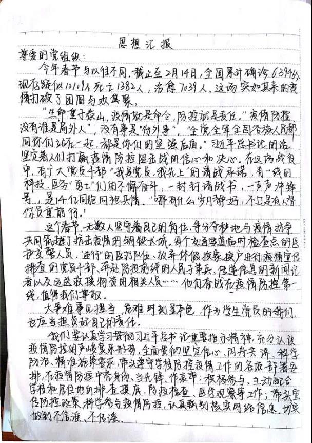 在支部的组织下,支部全体成员认真学习习近平总书记等中央关于新型冠状病毒感染肺炎疫情防控的重要指示和文件,充分利用微信平台、“学习强国”等媒介学习相关内容,切实提高思想认识。支部成员纷纷撰写思想汇报,将思想统一到中央精神以及决策部署上来,切实扛起疫情防控职责。