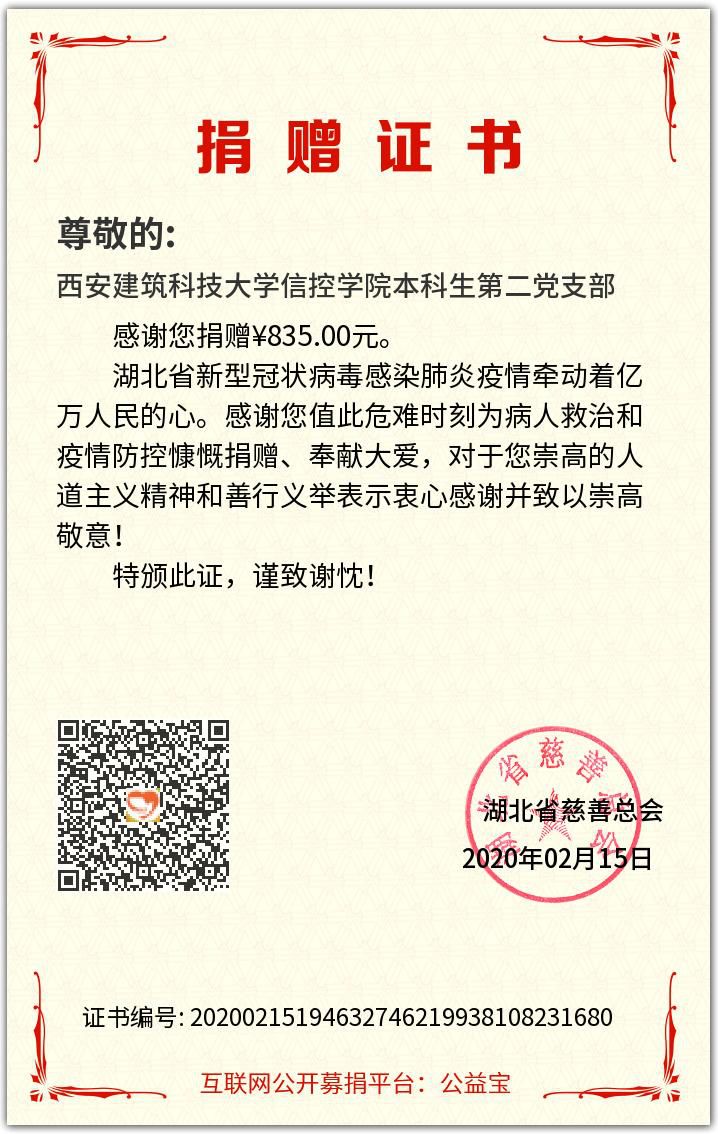 “病毒无情,人间有爱”,疫情面前,一个人的力量可能是微小的,但是千千万万的同胞共同伸出援手的力量是巨大的,为了驰援湖北,为疫区奉献自己的爱心,帮助疫区尽快渡过难关,支部按照公开透明自愿的原则开展爱心募捐活动,所筹善款均用于疫区抗击疫情。经募捐,支部共计筹集835元,并全部向湖北省慈善总会捐赠,确保所有的爱心捐款全部用于抗 击新型冠状病毒肺炎疫情。