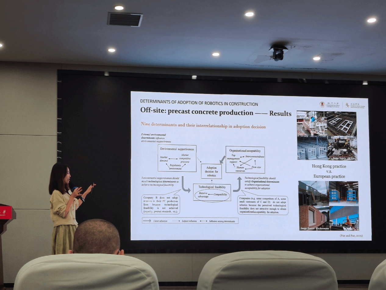 紧接着,潘觅将目光投向建筑行业面临的多重挑战,指出建筑机器人与模块化建筑是破局的关键。她系统阐述了三项前沿研究:一是用于分析建筑机器人未来路径的综合情景方法;二是预制混凝土领域应用机器人的关键决定因素;三是针对模块化建筑场外物流不确定性的随机Petri网综合调度方法。她强调,二者的深度融合是重塑建筑行业的核心驱动力。
