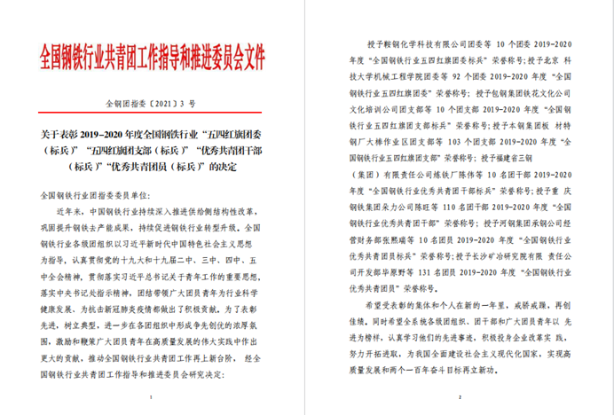 本次表彰授予何晶晶同学2019-2020年度全国钢铁行业“优秀共青团员”荣誉称号是实至名归,希望何晶晶同学在接下来的学习和生活中能发挥模范带头作用,让青春的力量在党旗引领下更加昂扬。