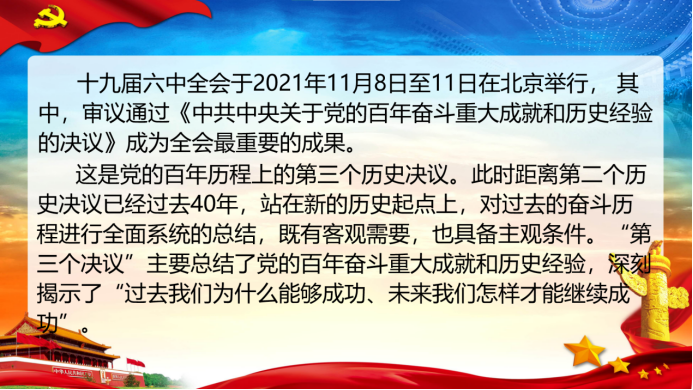 会议伊始,李博荣针对学生会改革的要求作以政策解读,明确学生会各部门工作职能,强调学生干部努力提升自身成绩、组织能力,提升自身素质。然后,带领全体学生会成员学习《中共中央关于党的百年奋斗重大成就和历史经验的决议》。此决议在党的十九届六中全会审议通过,会议总结了党的百年奋斗重大成就和历史经验,深刻揭示了“过去我们为什么能够成功、未来我们怎样才能继续成功”。同时,突出“中国特色社会主义新时代”这个重点,总结了党的十八大以来的原创性思想、变革性实践、突破性进展和标志性成果。