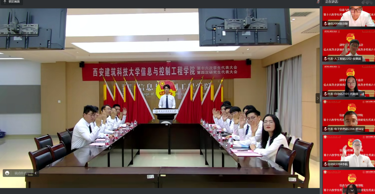 2022年9月27日晚,捷报比分app-捷报app 召开了第十六次学生代表大会和第四次研究生代表大会预备会议。会议采取线上线下相结合的方式,线下设信控楼504会议室为主会场,其余各年级学生代表于线上参加会议。捷报比分app 团委书记张颉,院团委副书记杨晓寒,西安建筑科技大学学生会主席团成员杨朋于,西安建筑科技大学研究生会主席团成员张凡,捷报比分app 各年级辅导员以及100名学生代表出席本次会议。会议由捷报比分app 学生会主席团成员杨剑桥主持。