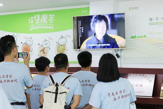 随后,冯书记带领实践团成员们参观了公司的产品展示间,并让实践团成员们免费品尝公司自己生产的魔芋产品,最后,在观看完公司介绍片后,冯书记为我们推荐了另几处适合调研的去处,并表达了自己对实践团本次实践调研的支持。