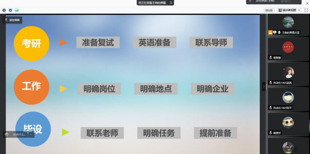 会前各年级辅导员与班主任积极沟通年级整体情况、班级思想动态、学生学习状况,各班班委积极配合老师做好会议预约、PPT准备等工作。班主任们通过线上主题班会向学生传达疫情防控工作的各项要求,从疫情认知到自我防护,从宣传抗击疫情倡议到学校相关通知公告,帮助学生增强责任意识和防护意识,加强学生教育引导和心理关怀,做好学生情况摸排管理,确保疫情期间信息畅通,努力引导学生做到安全健康和学习成材两不误。主题班会中,各班同学向班主任汇报了近期的学习、生活、志愿服务等情况,班主任们立足本班学生特点和年级工作重点,分别在基础知识学习、竞赛能力提升、考研规划引导、复试、就业准备等方面创造性开展日记打卡、笔记线上分享、竞赛手册汇编等工作安排。