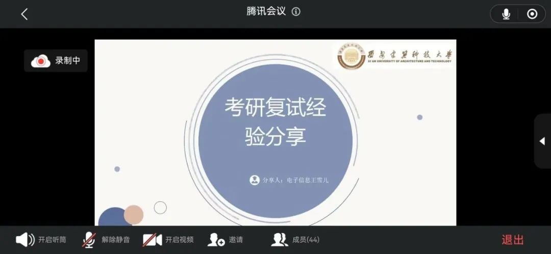 研究生会于3月6日19:00举办了一“研”为定——考研复试经验分享会。本次分享会由研究生会申晨同学主持,以线上线下相结合的方式进行。本次分享会邀请到于昊翔、王雪儿、李朝,程淳共4位优秀的学长学姐分别做了经验分享。