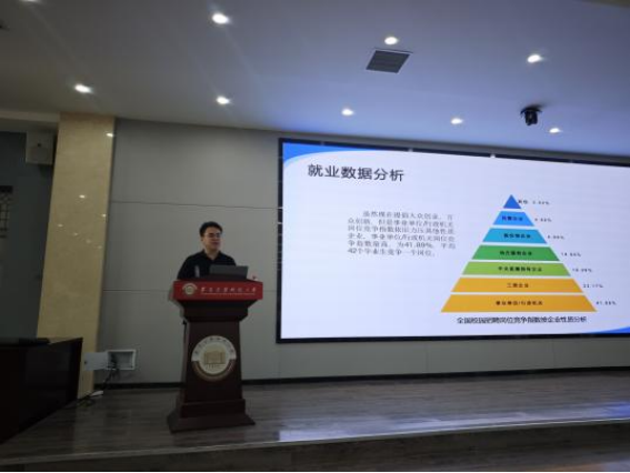 宣讲会伊始,杜瑶对参会的同学们表示热烈欢迎,并强调了此次就业工作宣讲会的重要性和紧迫性。首先他向同学们介绍了在当前竞争激烈的就业市场中,同学们需要提前做好职业规划,了解就业形势,掌握求职技巧,为顺利就业打下坚实的基础。其次分析了往届毕业生的就业形势情况,让同学们对就业形势有了更清晰的认识,最后针对就业信息网上操作流程进行了全面介绍,为毕业生们提供了宝贵的指导与建议。