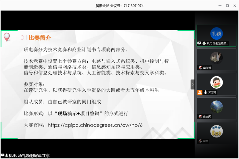大会第二部分,由第十四届中国研究生电子设计竞赛商业计划书专项赛初赛团队一等奖获得者王倩同学和第十四届中国研究生电子设计竞赛西北赛区团队三等奖获得者汤礼颖同学进行项目讲解、作品展示以及参赛经验交流分享。