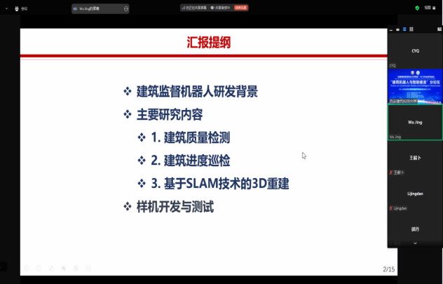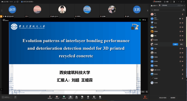 来自西安建筑科技大学的专家们也积极分享了本校在相关领域的最新研究进展。于军琪教授聚焦于大型复杂施工现场的安全管理难题,作了题为“大型复杂施工现场安全巡检机器人研究”的精彩报告,西安建筑科技大学刘超教授聚焦绿色建筑材料领域,作了“Evolution patterns ofinterlayer bonding performanceand deterioration detection model for 3D printed reeycled concrete”的英文报告。雷小康副教授以“机器人集群建造:发展现状与未来图景”为主题,汇报了团队在建筑机器人集群技术方面的最新研究成果及未来研究方向。