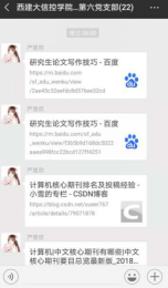 党员有行动,学术有创新。研究生第六党支部充分考虑支部外出党员实际情况,自11月23日起,组织支部成员依次轮流每天早上8点整定时在支部群内分享学术论文写作技巧、本专业论文顶级期刊、本专业学术论坛或峰会最新信息、本专业当前热点及难点等,并以党员为细胞,要求每位党员将支部分享内容分享至师门群,发挥党员带头作用,渗透至每位同学,营造捷报比分app