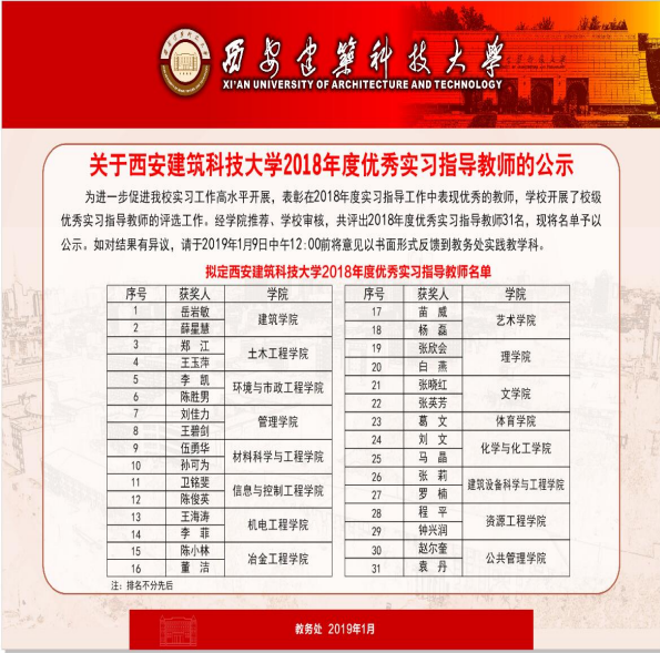 关于西安建筑科技大学2018年度优秀实习指导教师的公示