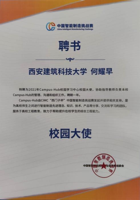 西安建筑科技大学Campus-Hub校园学习中心现由4名学生负责,分别是:自动化1703班何耀早同学,现任Campus-Hub校园大使,主要负责中心学习计划制定、开展活动组织等工作,曾多次参加“西门子杯”中国智能制造挑战赛,获全国初赛特等奖及全国总决赛二等奖。自动化1802班李朝阳同学,现任Campus-Hub技术部部长,主要负责日常培训中出现的技术问题与日常的实验设备维护工作,2020年荣获西门子杯智能制造挑战赛全国初赛二等奖,参与SSRT大学生科研计划训练项目两项。自动化1805班申瑞同学,现任Campus-Hub组织部部长,主要负责日常培训、学习、宣传等活动组织与协调工作,西安建筑科技大学第十四届学生会副主席,荣获“西门子杯”中国智能挑战赛全国初赛二等奖,参与SSRT大学生科研计划训练项目1项,授权一项软件著作权。自动化1804班陈廷廷,现任Campus-Hub宣传部部长,主要负责活动前期宣传策划与编辑工作,获得全国大学生数学竞赛省二等奖,参加SSRT大学生科研计划训练项目一项。