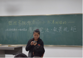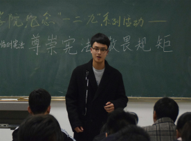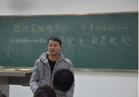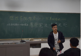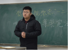 全体师生做好宪法宣传教育。张雨明首先为成员们普及宪法基本知识,他提到:宪法是国家的根本大法,是治国安邦的总章程。我们要完善以宪法为核心的中国特色社会主义,任何组织或个人都不得有超越宪法和法律的特权,同时我们也要成为宪法的忠实崇尚者、自觉遵守者、坚定捍卫者。他结合同学们的生活实际,向大家讲述了宪法精神。每个人都要认清自己的身份,做自己该做的事。作为学生,要做到遵守校纪校规、学术诚信;作为宣传工作者,要规范自身言行,对自己和他人负责,通过运用传媒宣传带动更多人学法、普法、敬法。