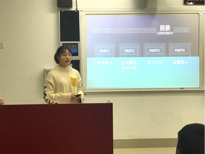 随后,2016级赵珣作考试经验分享,她首先向大家说明了英语学习、四级考试通过的重要性,并分别从词汇、听力、综合阅读、写作翻译四大方面对试题中的各类题型都进行了微观分析,并就自己总结的答题技巧与大家进行了分享。