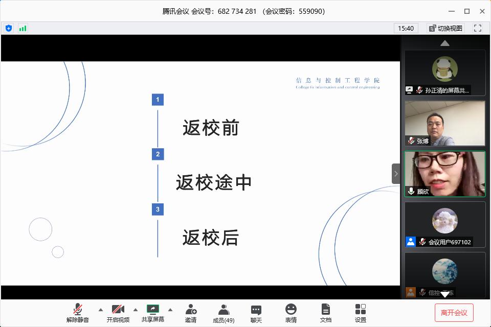 根据学校统一安排部署,部分学生将于近期分批错峰返校,为切实做好疫情防控和学生返校工作,5月9日上午,捷报比分app 召开学生返校工作线上会议,安排捷报比分app 返校工作方案,强调学生返校注意事项。捷报比分app 党委副书记、副院长张博,学工办主任、研究生辅导员顾欣,本科生2016级辅导员王栋,2019级辅导员孙正清以及全体返校学生参加此次会议。