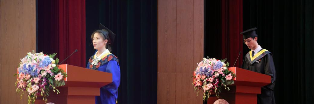 对毕业生培养和期望,在以后的人生道路上努力奋斗,为家国洒热血、为真理献生命,始终堂堂正正、坦坦荡荡做人。优秀毕业生代表席文静和杨剑桥回顾大学的美好时光,并表示未来都将以“为人诚实,基础扎实,作风朴实,工作踏实”的校风要求自己,以“自强,笃实,求源,创新”的校训勉励自己,为母校争光添彩,用努力和成功来回报社会,回报母校。