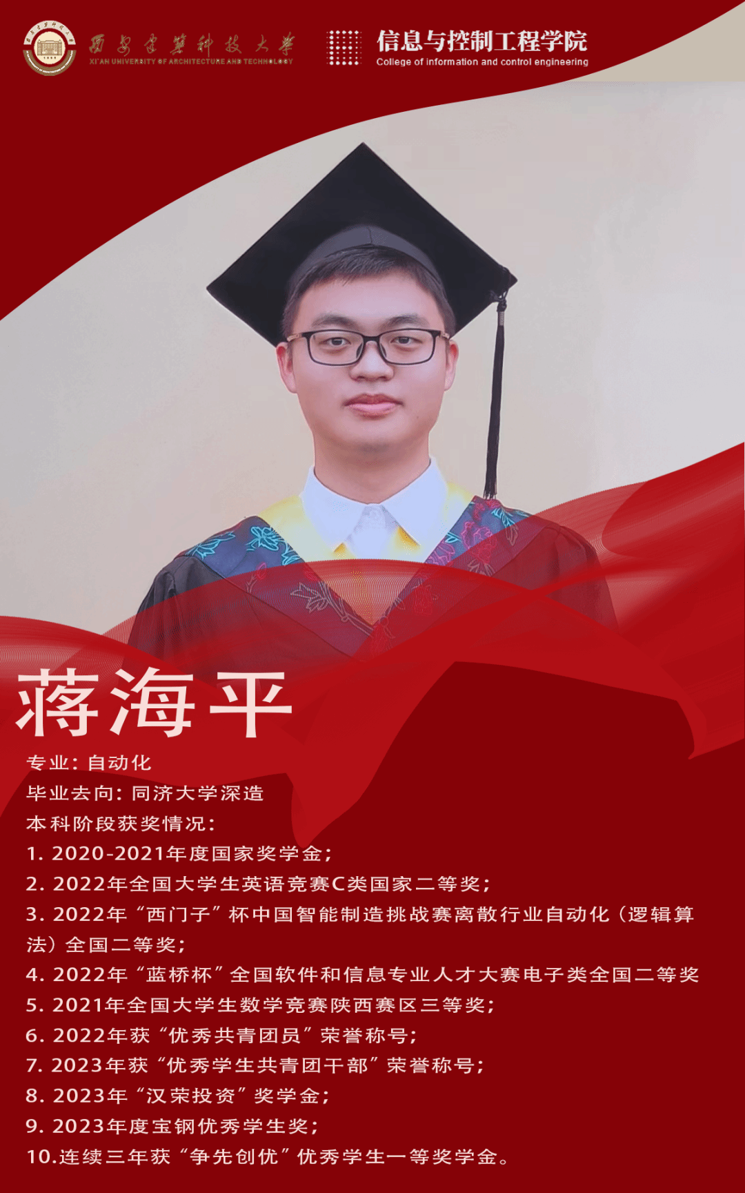 蒋海平,中共党员。现为同济大学研究生。曾担任校团委基层团建中心智慧团建组组长、自动化2004班文艺委员。本科期间,曾获评国家奖学金、“汉荣投资”奖学金、宝钢优秀学生奖、“争先创优”优秀学生一等奖、优秀共青团员、优秀学生共青团干部等多项荣誉奖励。曾参与多项专业竞赛及创新创业比赛,获国家级奖项4项,省部级奖项8项。积极参加志愿服务活动,多次担任校园活动志愿者。