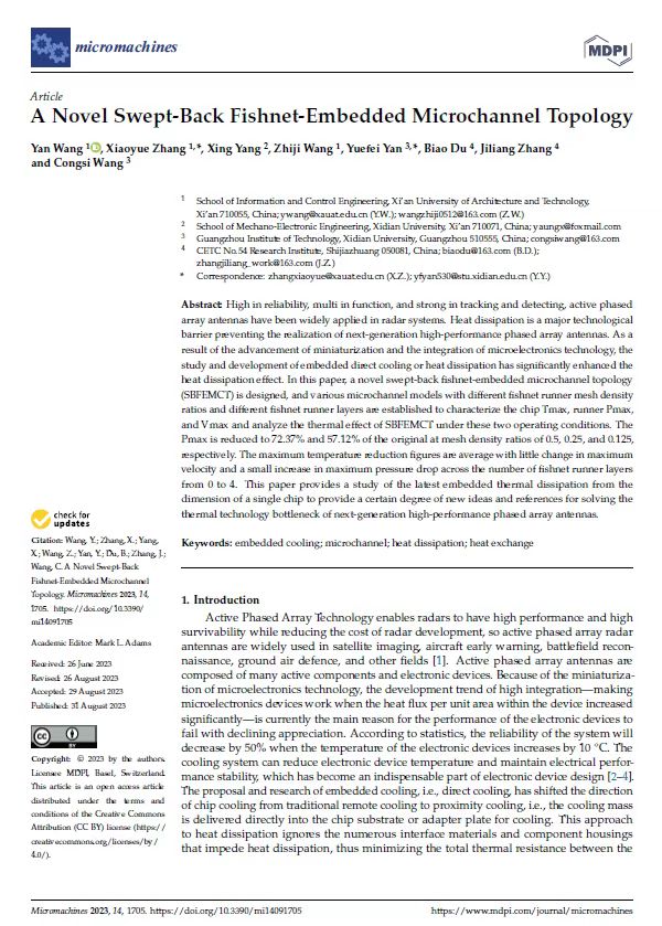 王艳副教授指导下,在SCI期刊《Micromachines》(中科院三区,IF: 3.4),发表题为“A Novel Swept-Back Fishnet-Embedded Microchannel Topology”科研论文。