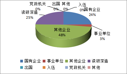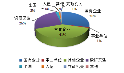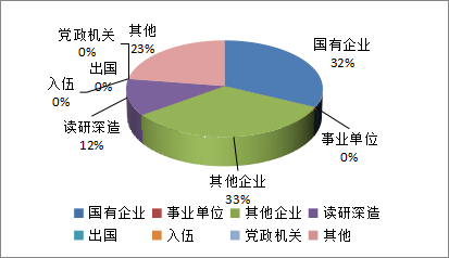 本专业就业率高,毕业生主要在土木建筑、信息技术、钢铁冶金等行业从事系统分析与设计、集成与开发、运行与管理等方面的工作,单位性质主要集中在国有企业、三资企业及其他企业、教育科研单位、党政机关及事业单位。近三年我校自动化专业本科毕业生去向分布如图2-1至2-3。